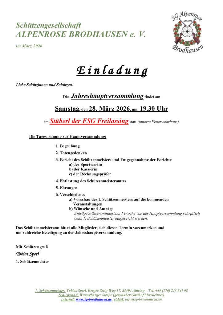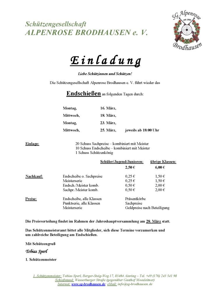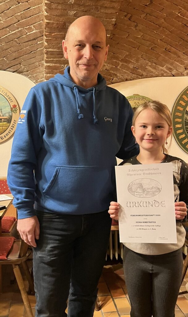 Die SG Alpenrose Brodhausen hat ihre neuen Schützenkönige. Bei den Stehend-frei Schützen krönt sich Evi Romstädter mit einem 35,9 Teiler zur Schützenkönigin. Bei den Aufgelegt-Schützen gewinnt Margit Birnbacher mit einem 25,3 Teiler. Auch in der Jugend/Junioren und Schülerklasse wurden die neuen Könige gekürt.