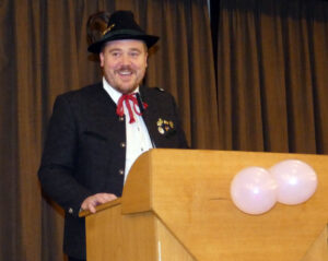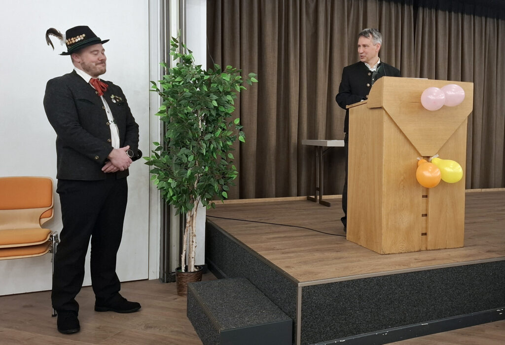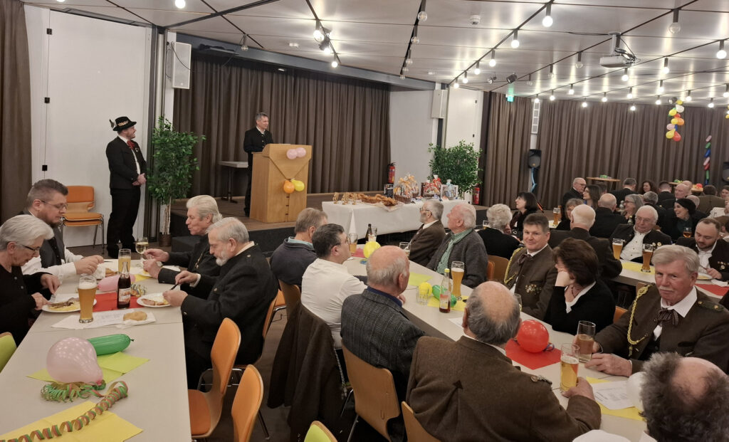 Im faschingsmäßig dekorierten Rathaussaal begrüßte 1. Schützenmeister Tobias Sperl Gäste und Teilnehmer zur Siegerehrung. Ein besonderer Gruß galt 1. Bürgermeister und Schirmherrn Markus Hiebl und ebenso den Schützenmeistern, Ehrenschützenmeister und Ehrenmitglieder der teilnehmenden Vereine. Wie schon die Jahre zuvor sorgte die Metzgerei Winkelmair wieder für das Catering, allerdings diesmal mit Selbstbedienung. Hernach bat Sperl Bürgermeister Hiebl um dessen Grußwort.