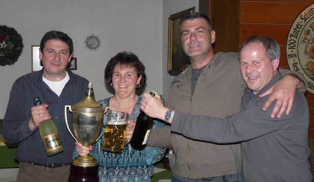 v. l.: Sieger im Geschicklichkeits-Dreikampf Stefan Prantler (P), Gewinnerin des Loserpokals Ingrid Öttl (B), der zweitplatzierte Peter Mertl (P) und der Dritte Arno Hamberger (B) zeigten, daß ihnen der Bewerb viel Spaß bereitet hat.